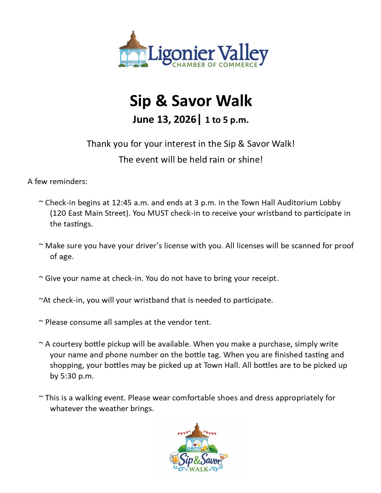 Sip, stroll, and savor your way through Ligonier! Enjoy a flavorful adventure as you explore town sampling delicious drinks and savory treats from local favorites. Grab your friends, soak in the charm, and taste it all. Tickets are limited—don’t miss this unforgettable experience! Tickets are just $25 each. 21+ and non-refundable.